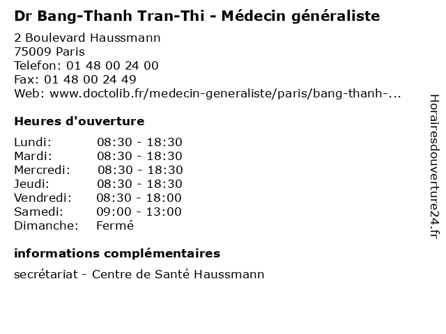 1 Dr Phuong-Hoang Amandine Tran - Médecin généraliste (Distance: 0,63 km) 6 Rue de la Banque, 75002 Paris amandine, consultation, docteur, dr, généraliste, hoang, med, médecin, phuong, traitement, tran 2 Dr Bang-Thanh Tra-Thi - Médecin généraliste (Distance: 0,80 km) 106 Rue Réaumur, 75002 Paris bang, dr, généraliste, médecin, médecine, médical, pharmaceutique, thanh, thi, tra, traitement 3 Studio Mihabodytec - My Big Bang (Distance: 1,30 km) 66 Rue du Faubourg Saint-Martin, 75010 Paris bang, big, club, fitness, mihabodytec, my, remise en forme, sport, studio 4 5 Thi-Ly Nguyen - Avocat (Distance: 2,13 km) 2 Boulevard Raspail, 75007 Paris avocat, avocats, droit, lois, ly, nguyen, service, thi 6 Dr Charles Henri Tran Ba - Chirurgien-dentiste (Distance: 2,69 km) 137 Rue du Faubourg du Temple, 75010 Paris ba, charles, chirurgien, consultation, dentiste, docteur, dr, henri, med, médecin, traitement, tran |