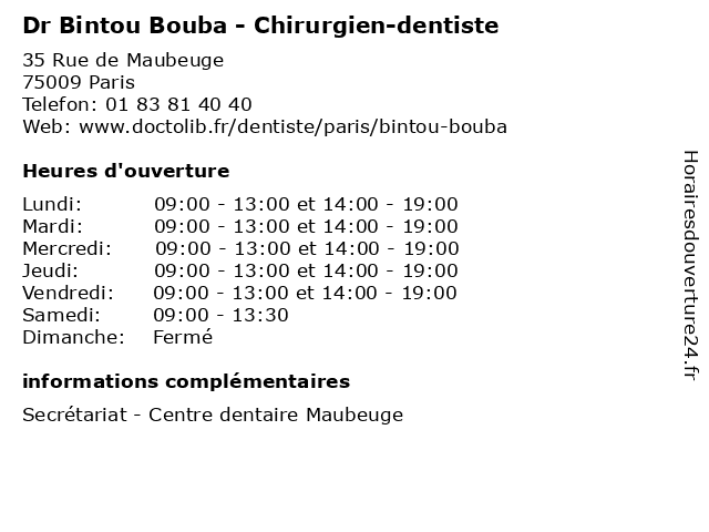 | Lundi | 09:00-13:00 et 14:00-19:00 |