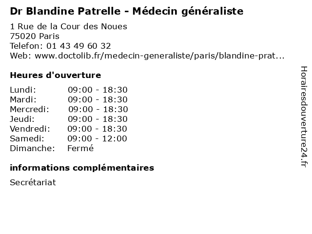 1 Blandine Berthet - Psychologue (Distance: 1,28 km) 163 Rue Charonne, 75011 Paris berthet, blandine, cabinets, médecins, psychologue, secrétariat, thérapies 2 Blandine Fremont Levasseur - Dermatologue et vénérologue (Distance: 1,69 km) 75 Rue des Pyrénées, 75020 Paris blandine, dermatologie, dermatologue, et, fremont, levasseur, paris, santé, thérapie, vénérologue 3 Dr Blandine Dozieres-Puyravel - Pédiatre (Distance: 1,74 km) 48 boulevard Sérurier, 75019 Paris blandine, consultation, docteur, dozieres, dr, med, médecin, puyravel, pédiatre, traitement 4 Dr Blandine Marion - Chirurgien orthopédiste (Distance: 2,19 km) rue du Sergent Bauchat, 75012 Paris blandine, chirurgien, consultation, docteur, dr, marion, med, médecin, médecine, orthopédiste, traitement 5 Dr. Blandine Prévost - Pédiatre (Distance: 2,30 km) 26 avenue du Dr Arnold Netter, 75012 Paris blandine, consultation, docteur, dr., med, medecine, medical, médecin, prévost, pédiatre, traitement 6 Maître Blandine de Badereau de Saint Martin - Avocate (Distance: 2,93 km) 9 Place de la République, 75003 Paris avocate, avocats, badereau, blandine, cabinet, conseils, contentieux, de, juridique, justice, litiges, martin, maître, saint, services |