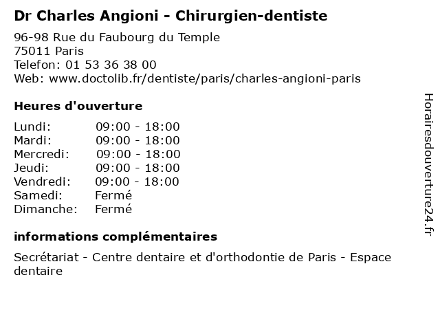 1 Dr Charles Henri Tran Ba - Chirurgien-dentiste (Distance: 0,17 km) 137 Rue du Faubourg du Temple, 75010 Paris ba, charles, chirurgien, consultation, dentiste, docteur, dr, henri, med, médecin, traitement, tran 3 Charles Paccagnini - Masseur-kinésithérapeute (Distance: 0,77 km) 6 Rue de l'Hôpital Saint-Louis, 75010 Paris charles, kiné, kinésithérapeute, masseur, paccagnini, rééducation, soin 5 Dr Charles Sitbon - Ophtalmologue (Distance: 0,82 km) 44 Avenue Mathurin Moreau, 75019 Paris charles, docteur, dr, médecin, ophtalmologie, ophtalmologue, sitbon 6 Dr Charles Sitbon - Ophtalmologue - Consultations et Examens Specialises (Distance: 0,86 km) 29 Rue Manin, 75019 Paris charles, consultations, dr, et, examens, médecin, médecine, médical, ophtalmologue, pharmaceutique, sitbon, specialises, traitement |
