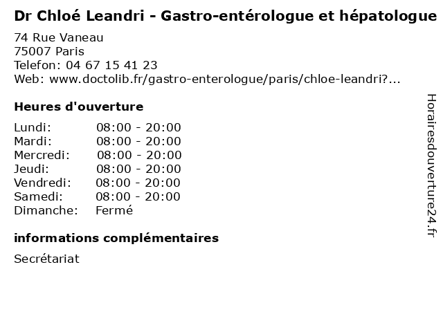 1 Dr Chloé Leandri - Gastro-entérologue et hépatologue (Distance: 0,94 km) 96 Boulevard du Montparnasse, 75014 Paris chloé, dr, enterelogue, entérologue, et, gastro, hepatolgue, hépatologue, leandri, soins 2 Dr Selma Demirci-Cellier - Gastro-entérologue et hépatologue (Distance: 0,17 km) 2 rue Rousselet, 75007 Paris cellier, consultation, demirci, demirici, docteur, dr, entérologue, et, gastro, hépatologue, med, médecin, selma, traitement 3 Dr Philippe Amoyal - Gastro-entérologue et hépatologue (Distance: 0,17 km) 2 Rue Rousselet, 75007 Paris amoyal, consultation, docteur, dr, entérologue, et, gastro, hépatologue, med, médecin, philippe, traitement 4 Chloé (Distance: 0,38 km) 24 rue de Sèvres, 75007 Paris accessoires pour femmes, chloé, prêt à porter, vêtements 5 Chloé Ravard - Masseur-kinésithérapeute (Distance: 0,49 km) 79 Rue de Vaugirard, 75006 Paris chloé, docteur, kine, kinesitherapeute, kinésithérapeute, masseur, ravard 6 Chloé Serror - Sage-femme (Distance: 0,53 km) 149 rue de Sèvres, 75015 Paris chloe, chloé, consultation, docteur, dr, femme, med, médecin, sage, serror, traitement |