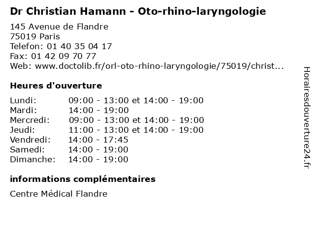 2 Dr Christian De Brier - Médecin généraliste (Distance: 0,69 km) 128 boulevard MacDonald, 75019 Paris brier, christian, consultation, de, docteur, dr, généraliste, med, médecin, traitement 3 Dr Marc-Antoine Chouha - Oto-rhino-laryngologiste (Distance: 1,01 km) 3 Rue du Maroc, 75019 Paris antoine, chouha, dr, laryngologiste, marc, médecin, médecine, médical, oto, pharmaceutique, rhino, traitement 4 Dr Thierry Galat - Oto-rhino-laryngologiste (Distance: 1,01 km) 3 Rue du Maroc, 75019 Paris dr, galat, laryngologiste, médecin, médecine, médical, oto, pharmaceutique, rhino, thierry, traitement 5 Dr Jacqueline Ignatova - Oto-rhino-laryngologiste (Distance: 1,01 km) 3 Rue du Maroc, 75019 Paris dr, ignatova, jacqueline, laryngologiste, médecin, médecine, médical, oto, pharmaceutique, rhino, traitement 6 Dr. Chouha - Oto-Rhino-Laryngologie (Distance: 1,09 km) 17-19 Avenue de Flandre, 75954 Paris chouha, docteur, dr., laryngologie, medecins, oto, rhino, sante |