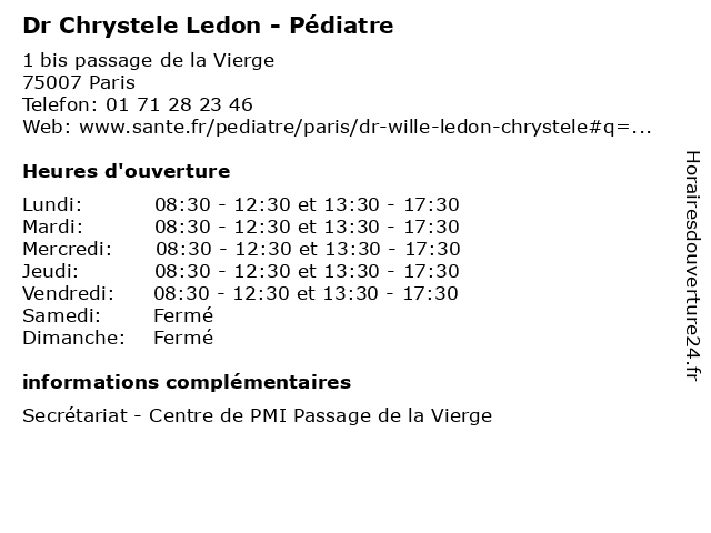 1 Dr Chrystele Ledon - Pédiatre (Distance: 1,67 km) 2 rue Léon Séché, 75015 Paris chrystele, consultation, docteur, dr, ledon, med, médecin, pédiatre, traitement 2 Dr Claire Villemain - Pédiatre (Distance: 0,00 km) 1 bis passage de la Vierge, 75007 Paris claire, consultation, docteur, dr, med, médecin, pédiatre, traitement, villemain 3 Dr Benedicte Mauvisseau - Pédiatre (Distance: 0,00 km) 1 bis passage de la Vierge, 75007 Paris benedicte, consultation, docteur, dr, mauvisseau, med, médecin, pédiatre, traitement 4 Dr Dominique Berdah - Pédiatre (Distance: 0,00 km) 1 bis passage de la Vierge, 75007 Paris berdah, consultation, docteur, dominique, dr, med, médecin, pédiatre, traitement 5 Dr Maha-Myriam Alchahabi-Hamwy - Pédiatre (Distance: 1,15 km) 40 Rue Miollis, 75015 Paris alchahabi, docteur, dr, hamwy, maha, myriam, médecin, pédiatre, pédiatrie 6 Dr. Jaby-Sergent Marie-Pierre - Pédiatre (Distance: 1,51 km) 4 Avenue de Camoëns -, 75016 Paris docteur, dr., jaby, marie, medecins, pierre, pédiatre, sante, sergent |
