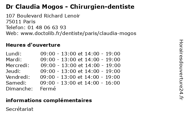 1 Dr Claudia Mogos - Chirurgien-dentiste (Distance: 1,10 km) 107 Boulevard Richard Lenoir, 75011 Paris chirurgien, claudia, consultation, dentiste, docteur, dr, med, mogos, médecin, médecine, secrétariat, traitement 2 Claudia Parascandolo - Naturopathe (Distance: 0,04 km) 103 Boulevard Richard Lenoir, 75011 Paris claudia, medecin, naturopathe, parascandolo, plante, sante 3 Claudia Boddin - Psychologue (Distance: 0,50 km) 64 Rue Amelot, 75011 Paris boddin, claudia, folie, psychiatre, psychiatrie, psychiatrique, psychologue 4 Dr Claudia Righini - Médecin de la reproduction (Distance: 4,76 km) 39 Rue de Berri, 75008 Paris claudia, de, dr, la, médecin, médecins, médicaments, reproduction, righini, santé, secrétariat, spécialiste 5 Dr Claudia de Melo Francisco - Chirurgien-dentiste (Distance: 5,69 km) 128 Boulevard Brune, 75014 Paris 14eme, centre, chirurgien, claudia, de, dentaire, dentiste, dr, d’orleans, francisco, français, implantologie, melo, paris, parodontologie, porte 6 Claudia Viegas - Sage-femme (Distance: 9,22 km) 6 Rue de Plaisance, 94130 Nogent-sur-Marne claudia, femme, medical, sage, sagefemme, viegas |