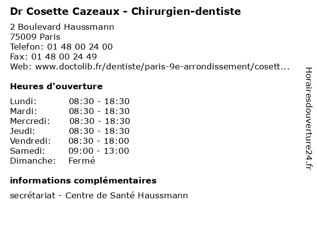 1 Dr Cosette Cazeaux - Chirurgien-dentiste (Distance: 5,50 km) 5 Rue Ponscarme, 75013 Paris cazeaux, chirurgien, consultation, cosette, dentiste, docteur, dr, med, médecin, médecine, secrétariat, traitement 2 Au Jardin de Cosette (Distance: 16,83 km) 23 rue Henri Barbusse, 93370 Montfermeil au, cosette, de, fleuristes, fleurs, jardin, jardineries, pépinières 3 Dr Albert Nguyen - Chirurgien-dentiste (Distance: 0,00 km) 2 Boulevard Haussmann, 75009 Paris albert, chirurgien, consultation, dentiste, docteur, dr, med, médecin, médecine, nguyen, secrétariat, traitement 4 Dr Bruno Bastiani - Chirurgien-dentiste (Distance: 0,00 km) 2 Boulevard Haussmann, 75009 Paris bastiani, bruno, chirurgie, chirurgien, dentaire, dentiste, dr 5 Dr Charles Larger- Chirurgien-dentiste (Distance: 0,00 km) 2 Boulevard Haussmann, 75009 Paris charles, chirurgie, chirurgien, dentaire, dentiste, dr, drcharles, larger 6 Dr Francine Amar - Chirurgien-dentiste (Distance: 0,00 km) 2 Boulevard Haussmann, 75009 Paris amar, chirurgien, consultation, dentiste, docteur, dr, francine, med, médecin, médecine, secrétariat, traitement |