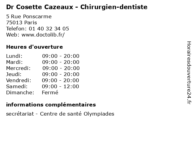 1 Dr Cosette Cazeaux - Chirurgien-dentiste (Distance: 5,50 km) 2 Boulevard Haussmann, 75009 Paris cazeaux, chirurgien, consultation, cosette, dentiste, docteur, dr, med, médecin, médecine, secrétariat, traitement 2 Au Jardin de Cosette (Distance: 16,59 km) 23 rue Henri Barbusse, 93370 Montfermeil au, cosette, de, fleuristes, fleurs, jardin, jardineries, pépinières 3 Dr Jacques Poujol - Chirurgien-dentiste (Distance: 0,00 km) 5 Rue Ponscarme, 75013 Paris chirurgien, consultation, dentiste, docteur, dr, jacques, med, médecin, médecine, poujol, secrétariat, traitement 4 Dr Caroline Peyretou - Chirurgien-dentiste (Distance: 0,00 km) 5 rue Ponscarme, 75013 Paris caroline, chirurgien, dentiste, dr, médecin, médecine, médical, peyretou, pharmaceutique, traitement 5 Dr Anaëlle Chauvin - Chirurgien-dentiste (Distance: 0,00 km) 5 rue Ponscarme, 75013 Paris anaëlle, chauvin, chirurgien, dentiste, dr, médecin, médecine, médical, pharmaceutique, traitement 6 Dr Sylvia Da Mariana - Chirurgien-dentiste (Distance: 0,00 km) 5 Rue Ponscarme, 75013 Paris chirurgien, consultation, da, dentiste, docteur, dr, mariana, med, médecin, sylvia, traitement |