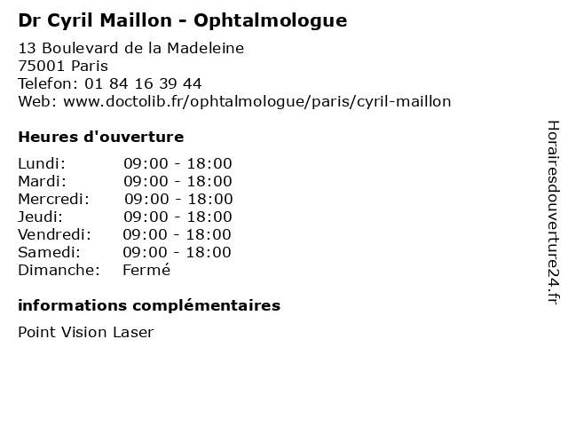 1 Dr Cyril Maillon - Ophtalmologue (Distance: 0,28 km) 10 Rue Royale, 75008 Paris consultation, cyril, docteur, dr, maillon, med, médecin, ophtalmologue, traitement 2 Dr Haythem Kahlaoui - Ophtalmologue (Distance: 0,00 km) 13 Boulevard de la Madeleine, 75001 Paris centre medical, dr, haythem, kahlaoui, médecin, médecine, médical, ophtalmologue, pharmaceutique, secretariat, traitement 3 Dr. Marta Dumas - Ophtalmologue (Distance: 0,32 km) 33 Rue de Caumartin, 75009 Paris docteur, dr., dumas, marta, medecins, ophtalmologie, ophtalmologue, sante 4 Maître Cyril Philibert - Avocat (Distance: 0,35 km) 2 rue Saint-Florentin, 75001 Paris avocat, cyril, droit, maître, négociation, philibert 5 Dr Marie-Christine Bayen - Ophtalmologue (Distance: 0,36 km) 9 Rue Boudreau, 75009 Paris bayen, christine, consultation, docteur, dr, marie, med, médecin, ophtalmologue, traitement 6 Dr Nadine Hueber Tichadou - Ophtalmologue (Distance: 0,36 km) 9 Rue Boudreau, 75009 Paris consultation, docteur, dr, hueber, med, médecin, nadine, ophtalmologue, tichadou, traitement |