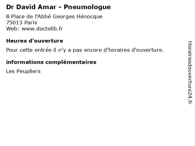 1 Dr David Zbili - Chirurgien orthopédiste (Distance: 0,00 km) 8 Place de l'Abbé Georges Hénocque, 75013 Paris chirurgien, consultation, david, docteur, dr, med, médecin, médecine, orthopédiste, secrétariat, traitement, zbili 2 Dr Tasnime Issoufaly - Pneumologue (Distance: 0,01 km) 8 Place de l'Abbé Georges Hénocque, 75013 Paris consultation, docteur, dr, issoufaly, med, médecin, médecine, pneumologue, secrétariat, tasnime, traitement 3 Dr Ali Zeggane - Pneumologue (Distance: 0,32 km) 12 Rue du Moulin de la Pointe, 75013 Paris ali, allergie, allergologie, dr, pneumologie, pneumologue, zeggane 4 Dr David Berros - Chirurgien-dentiste (Distance: 0,45 km) 61 Avenue d'Italie, 75013 Paris berros, chirurgien, david, dentaire, dentiste, dr, implantologie, parodontologie 5 Jean Louis David (Distance: 0,48 km) 117 Avenue d'Italie, 75013 Paris beaute, coiffure, david, jean, louis 6 Jean-Louis David (Distance: 0,49 km) 68 Avenue d' Italie, 75013 Paris coiffeur, david, jean, louis, mixte |