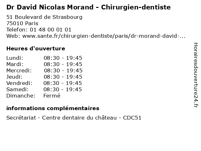 1 Dr Nicolas Harmouche - Chirurgien-dentiste (Distance: 0,06 km) 34 Boulevard de Strasbourg, 75010 Paris chirurgien, consultation, dentiste, docteur, dr, harmouche, med, médecin, nicolas, traitement 2 ANMA - Agence Nicolas Michelin & Associés (Distance: 0,25 km) 9 Cour des Petites Écuries, 75010 Paris agence, anma, architecte, architecture, associés, batiment, construction, design, michelin, nicolas 3 Nicolas Brunet - Masseur-kinésithérapeute (Distance: 0,27 km) 34 Rue du Faubourg Saint-Martin, 75010 Paris brunet, consultation, docteur, kinésithérapeute, masseur, med, médecin, médecine, nicolas, traitement 4 Nicolas Magenta (Distance: 0,41 km) 83 Boulevard de Magenta, 75010 Paris champagnes, cidre, magenta, nicolas, rhums, rosé, ruinart, spiritueux, vins, vins blancs, vins rouges, whiskies 5 Dr. Nicolas De Chanaud - Médecine générale (Distance: 0,57 km) 323 Rue Saint-Martin, 75003 Paris chanaud, de, docteur, dr., générale, medecins, médecine, nicolas, sante 6 Ettien Adouakoua Assielou Nicolas (Distance: 0,72 km) 37 Rue d Alsace, 75010 Paris adouakoua, assielou, ettien, nicolas, restaurants |