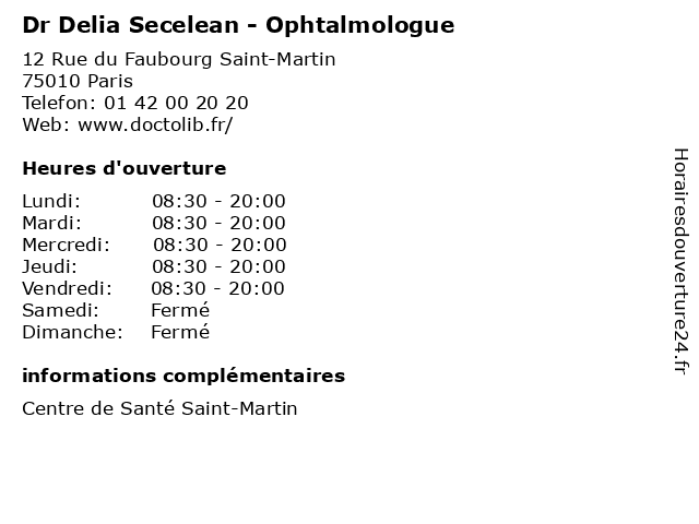 1 Dr Delia Secelean - Ophtalmologue (Distance: 2,70 km) 4 Rue de Thionville, 75019 Paris consultation, delia, docteur, dr, med, médecin, médecine, ophtalmologue, secelean, secrétariat, traitement 2 Dr Abderrahmane Bey - Ophtalmologue (Distance: 0,00 km) 12 Rue du Faubourg Saint-Martin, 75010 Paris abderrahmane, bey, dr, médecin, médecine, médical, ophtalmologue, pharmaceutique, traitement 3 Dr Sophie Boucher - Ophtalmologue (Distance: 0,00 km) 12 Rue du Faubourg Saint-Martin, 75010 Paris boucher, dr, médecin, médecine, médical, ophtalmologue, pharmaceutique, sophie, traitement 4 Dr Samuel Derman - Ophtalmologue (Distance: 0,00 km) 12 Rue du Faubourg Saint-Martin, 75010 Paris derman, dr, médecin, médecine, médical, ophtalmologue, pharmaceutique, samuel, traitement 5 Dr Nezli Dali-Ahmed - Ophtalmologue (Distance: 0,00 km) 12 Rue du Faubourg Saint-Martin, 75010 Paris ahmed, dali, dr, médecin, médecine, médical, nezli, ophtalmologue, pharmaceutique, traitement 6 Dr Yves Elhaik - Ophtalmologue (Distance: 0,00 km) 12 Rue du Faubourg Saint-Martin, 75010 Paris dr, elhaik, médecin, médecine, médical, ophtalmologue, pharmaceutique, traitement, yves |