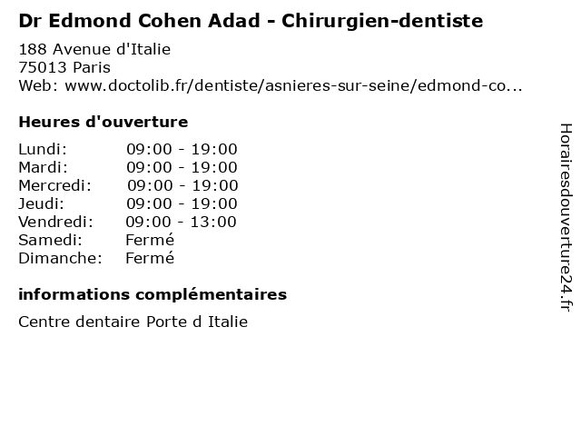 1 Dr Edmond Cohen Adad - Chirurgien-dentiste (Distance: 5,19 km) 46 Rue des Orteaux, 75020 Paris adad, chirurgien, cohen, dentiste, dr, edmond, médecin, médecine, médical, pharmaceutique, traitement 2 Dr Edmond Cohen Adad - Chirurgien-dentiste (Distance: 11,76 km) 12 Rue de Lorraine, 92600 Asnières-sur-Seine adad, chirurgien, cohen, dentaire, dentiste, dr, edmond, implantologie, parodontologie 3 Arlette Cohen - Ophtalmologue (Distance: 0,85 km) 39 Avenue d'Italie, 75013 Paris arlette, cohen, medical, ophtalmologue, orthoptique, orthoptiste, strabologie 4 Dr Abehassera Cohen-Dentiste (Distance: 0,96 km) 15 Rue Guyton de Morveau, 75013 Paris abehassera, cohen, consultation, dentiste, docteur, dr, santé 5 Dr Laure Cohen - Pédiatre (Distance: 1,00 km) 44 Rue Charles Moureu, 75013 Paris cohen, consultation, docteur, dr, laure, med, médecin, pédiatre, traitement 6 Dr Elsa Benitah Cohen - Médecin généraliste (Distance: 1,13 km) 2 Avenue Eugène Thomas, 94270 Le Kremlin-Bicêtre benitah, cohen, docteur, dr, elsa, generaliste, généraliste, medecin, médecin, soins |