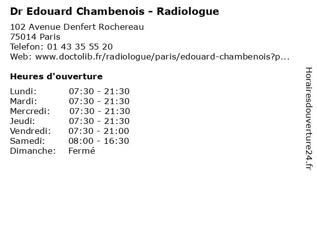 1 Dr Edouard Chambenois - Radiologue (Distance: 1,34 km) 119 Avenue du Général Leclerc, 75014 Paris chambenois, consultation, docteur, dr, edouard, med, médecin, radiologue, traitement 2 Dr Edouard Chambenois - Radiologue (Distance: 1,95 km) 114 Boulevard Saint-Germain, 75006 Paris chambenois, dr, edouard, médecin, médecine, médical, pharmaceutique, radiologue, secretariat, traitement 3 Dr Edouard Chambenois - Radiologue (Distance: 2,25 km) 21 Rue Barbet de Jouy, 75007 Paris chambenois, dr, edouard, médecin, médecine, médical, pharmaceutique, radiologue, secretariat, traitement 4 Dr Edouard Chambenois - Radiologue (Distance: 2,97 km) 143 Avenue de la République, 92120 Montrouge chambenois, dr, edouard, médecin, médecine, médical, pharmaceutique, radiologue, secretariat, traitement 5 Dr Edouard Jawish - Dentiste (Distance: 0,43 km) 9 Rue Ernest Cresson,, 75014 Paris care, clinic, dentiste, dr, edouard, jawish, medecin 6 Babilou Paris Edouard Jacques (Distance: 0,83 km) 18-20 Rue edouard jacques, 75014 PARIS babilou, edouard, jacques, paris |