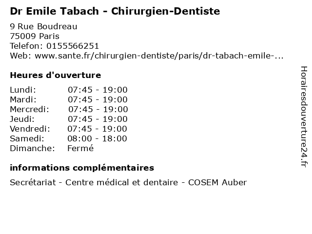 1 Dr Emile Tabach - Chirurgien-dentiste (Distance: 4,80 km) 128 Boulevard Macdonald, 75019 Paris chirurgien, dentiste, dr, emile, médecin, médecine, médical, pharmaceutique, tabach, traitement 2 Dr Emile Ohayon - Chirurgien-Dentiste (Distance: 0,00 km) 9 Rue Boudreau, 75009 Paris chirurgien, consultation, dentiste, docteur, dr, emile, med, médecin, ohayon, traitement 3 Joaillerie Emile Leon (Distance: 0,66 km) 8 Rue Royale, 75008 Paris boutique, emile, horloge, horlogerie, horloges, joaillerie, leon, montre, montres 4 Maître Paul Emile Boutmy - Avocat (Distance: 0,88 km) 18 Rue Drouot, 75009 Paris avocat, avocats, boutmy, cabinet, conseils, contentieux, emile, juridique, justice, litiges, maître, paul, services 5 Maître Emile Troboul - Avocat (Distance: 1,27 km) 146 Boulevard Haussmann, 75008 Paris avocat, avocate, avocats, cabinet, conseils, contentieux, emile, juridique, justice, litiges, maître, services, troboul 6 Dr Hanna Tabach - Médecin généraliste (Distance: 1,31 km) 7 Rue Bergère, 75009 Paris consultation, docteur, dr, généraliste, hanna, med, médecin, tabach, traitement |