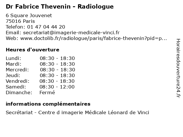 1 Dr Fabrice Thevenin - Radiologue (Distance: 0,46 km) 37 Rue Molitor, 75016 Paris consultation, docteur, dr, fabrice, med, médecin, radiologue, thevenin, traitement 2 Dr Fabrice Thevenin - Radiologue (Distance: 1,36 km) 80 Avenue Felix Faure, 75015 Paris consultation, docteur, dr, fabrice, med, médecin, radiologue, thevenin, traitement 3 Dr Fabrice Thevenin - Radiologue (Distance: 2,23 km) 43 Rue Cortambert, 75116 Paris dr, fabrice, médecin, médecine, médical, pharmaceutique, radiologue, secretariat, thevenin, traitement 4 Dr Fabrice Thevenin - Radiologue (Distance: 2,23 km) 43 Rue Cortambert, 75016 Paris dr, fabrice, médecin, médecine, médical, pharmaceutique, radiologue, secretariat, thevenin, traitement 5 Dr Fabrice Thevenin - Radiologue (Distance: 3,52 km) 185 Rue Raymond Losserand, 75014 Paris dr, fabrice, médecin, médecine, médical, pharmaceutique, radiologue, secretariat, thevenin, traitement 6 Dr Fabrice Thevenin - Radiologue (Distance: 3,69 km) 5 bis rue du Dôme, 75116 Paris docteur, dr, fabrice, médecin, radiologie, radiologue, thevenin |