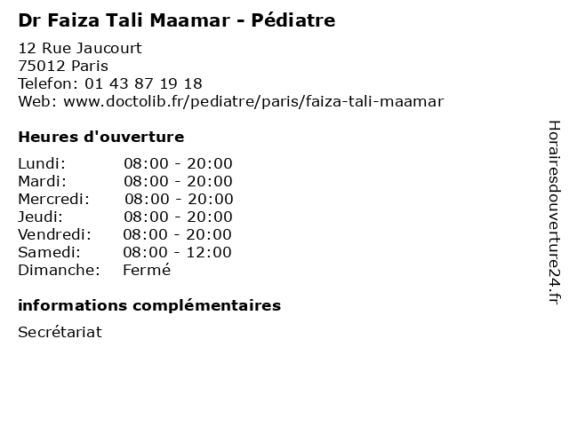 1 Dr Melhem Mazraani - Pédiatre (Distance: 0,11 km) 2 Rue Dorian, 75012 Paris consultation, docteur, dr, mazraani, med, melhem, médecin, médecine, pédiatre, secrétariat, traitement 2 Dr Maissoun Al-Refai - Pédiatre (Distance: 0,34 km) 12-18 rue du Sergent Bauchat, 75012 Paris al, consultation, docteur, dr, maissoun, med, médecin, médecine, pédiatre, refai, traitement 3 Dr Assia Daoudi - Pédiatre (Distance: 0,34 km) 12-18 rue du Sergent Bauchat, 75012 Paris assia, consultation, daoudi, docteur, dr, med, médecin, médecine, pédiatre, traitement 4 Dr Salima El Kinani - Pédiatre (Distance: 0,34 km) 12-18 rue du Sergent Bauchat, 75012 Paris consultation, docteur, dr, el, kinani, med, médecin, médecine, pédiatre, salima, traitement 5 Dr Samia Ishak - Pédiatre (Distance: 0,34 km) 12-18 rue du Sergent Bauchat, 75012 Paris consultation, docteur, dr, ishak, med, médecin, médecine, pédiatre, samia, traitement 6 Dr Claire Weill - Pédiatre (Distance: 0,34 km) 12-18 rue du Sergent Bauchat, 75012 Paris claire, consultation, docteur, dr, med, médecin, médecine, pédiatre, traitement, weill |