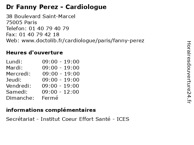 1 Dr Fanny Perez - Cardiologue (Distance: 5,39 km) 3 Rue Bernoulli, 75008 Paris cardiologue, dr, fanny, médecin, médecine, médical, perez, pharmaceutique, secretariat, traitement 2 Dr Fanny Perez - Cardiologue (Distance: 7,53 km) 34 Avenue du Général Sarrail, 75016 Paris cardiologue, consultation, docteur, dr, fanny, med, médecin, médecine, perez, traitement 3 Dr Anne Boisvieux-Lucas - Cardiologue (Distance: 0,00 km) 38 Boulevard Saint-Marcel, 75005 Paris anne, boisvieux, cardiologue, consultation, docteur, dr, lucas, med, médecin, médecine, secrétariat, traitement 4 Dr Alain Ducardonnet - Cardiologue (Distance: 0,00 km) 38 Boulevard Saint-Marcel, 75005 Paris alain, cardiologue, consultation, docteur, dr, ducardonnet, med, médecin, médecine, secrétariat, traitement 5 Dr Carine Ctorza-Perez - Chirurgien-dentiste (Distance: 0,47 km) 119 Rue Monge, 75005 Paris carine, chirurgien, ctorza, dentaire, dentiste, dr, implantologie, parodontologie, perez 6 Dr Carine Perez - Chirurgien-dentiste (Distance: 0,47 km) 119 Rue Monge, 75005 Paris carine, chirurgien, dentiste, dr, médecin, médecine, médical, perez, pharmaceutique, secretariat, traitement |