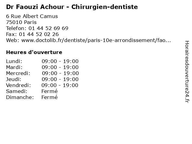 1 Dr Faouzi Achour - Chirurgien-dentiste (Distance: 0,02 km) 6 Rue Albert Camus, 75010 Paris achour, chirurgien, dentiste, dr, faouzi, médecin, médecine, médical, pharmaceutique, traitement 2 Selmoun Achour (Distance: 0,94 km) 141 Rue Du Faubourg Saint Denis, 75010 Paris achour, restaurants, selmoun 3 Touria Faouzi - Masseur-kinésithérapeute (Distance: 2,31 km) 39 bis Avenue Gambetta, 75020 Paris docteur, faouzi, kine, kinesitherapeute, kinésithérapeute, masseur, touria 4 Dr Faouzi Elmai - Chirurgien-dentiste (Distance: 2,93 km) 88 Bis Rue Damrémont, 75018 Paris chirurgien, chirurgien-dentiste, dentiste, dr, elmai, faouzi, médecins, médicaments, santé, secrétariat, spécialiste 6 Dr Faouzi Gloulou - Anesthésiste réanimateur (Distance: 4,94 km) 12 Rue Beaujon, 75008 Paris anes, anesthésiste, dr, faouzi, gloulou, réa, réanimateur |