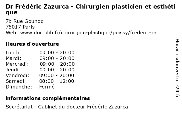 1 Dr Frédéric Zazurca - Chirurgien plasticien et esthétique (Distance: 4,32 km) 149 Rue de Sèvres, 75015 Paris chirurgien, consultation, docteur, dr, esthétique, et, frédéric, med, médecin, plasticien, traitement, zazurca 2 Maître Frédéric Delmer - Avocat (Distance: 0,11 km) 119 Rue de Courcelles, 75017 Paris avocat, avocats, cabinet, conseils, contentieux, delmer, frédéric, juridique, justice, litiges, maître, services 3 Dr Laura Azoulay - Chirurgien plasticien et esthétique (Distance: 0,24 km) 51 Rue Pierre Demours, 75017 Paris azoulay, chirurgien, docteur, dr, esthétique, et, laura, plasticien, sante, soins 4 Dr Gérald Franchi - Chirurgien plasticien et esthétique (Distance: 0,29 km) 6 Rue Puvis de Chavannes, 75017 Paris chirurgie, chirurgien, dr, esthétique, et, franchi, general, gérald, plasticien, soins 5 Dr Eric Sorrel Dejerine - Chirurgien plasticien et esthétique (Distance: 0,39 km) 22 Rue Alphonse de Neuville, 75017 Paris chirurgien, dejerine, dr, eric, esthétique, et, plasticien, sorrel 6 Centre de médecine Esthétique Alfa Laser Paris (Distance: 0,42 km) 8 Rue Theodule Ribot, 75017 Paris alfa, centre, cicatrice, de, détatouage, esthétique, injection, injection cernes, injection levre, laser, médecine, médecine esthétique, paris, vergeture |
