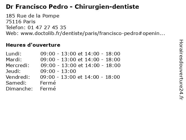 1 Francisco Jimenez Olle - Chirurgien-dentiste (Distance: 0,27 km) 10 Rue Leroux, 75116 Paris chirurgien, dent, dentiste, docteur, francisco, jimenez, olle, soins 2 Maître Pedro Cros Ramos - Avocat (Distance: 0,91 km) 14 Rue de Magdebourg, 75116 Paris avocat, avocats, cabinet, conseils, contentieux, cros, juridique, justice, litiges, maître, pedro, ramos, services 3 Pedro Santos - Pédicure-podologue (Distance: 1,24 km) 9 Rue le Tasse, 75116 Paris cheville, orteil, pedro, pied, podologue, pédicure, santos 4 Maître Léa Ribeiro Pedro - Avocate (Distance: 1,55 km) 5 rue François Ponsard, 75116 Paris avocate, avocats, cabinet, conseils, contentieux, juridique, justice, litiges, léa, maître, pedro, ribeiro, services 5 Maître Sandrine Pedro - Avocate (Distance: 1,57 km) 2-8 Rue Ancelle, 92200 Neuilly-sur-Seine avocate, avocats, civils, droits, juridiques, maître, pedro, sandrine 6 Pedro Perez - Masseur-kinésithérapeute (Distance: 1,60 km) 4 Rue Théodule Ribot, 75017 Paris kiné, kinésithérapeute, masseur, pedro, perez, rééducation, soin |