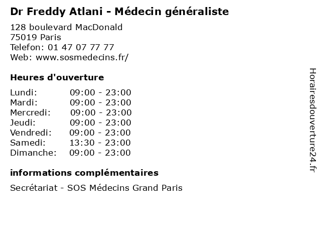 2 Restaurant Freddy's (Distance: 5,93 km) 54 Rue de Seine, 75006 Paris bar, freddy's, restaurant, restauration, tapas, vin 3 Atlani Macke Rachel (Distance: 6,19 km) Droite 3Eme Etage, 75007 Paris atlani, bailleurs, biens, immobiliers, macke, nra, rachel 4 Dr. Freddy Djebali - Médecine générale (Distance: 8,08 km) 18 avenue de la commune de Paris, 95140 Garges les Gonesse consultation, djebali, docteur, dr., freddy, générale, médecine, santé 5 Dr Marc Atlani - Gastro-entérologue et hépatologue (Distance: 10,17 km) 67 Avenue Foch, 92250 La Garenne-Colombes atlani, consultation, docteur, dr, entérologue, et, gastro, hépatologue, marc, med, médecin, médecine, traitement 6 Dr Esther Atlani - Chirurgien-dentiste (Distance: 12,30 km) 30 Avenue des Champs Pierreux, 92000 Nanterre atlani, chirurgien, dentaire, dentiste, dr, esther, implantologie, parodontologie |