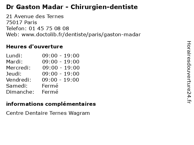 1 Dr Yoni Madar - Chirurgien plasticien et esthétique (Distance: 0,60 km) 4 Avenue Hoche, 75008 Paris chirurgien, consultation, docteur, dr, esthétique, et, madar, med, médecin, médecine, plasticien, traitement, yoni 2 Dr. Carly Madar - Dentiste (Distance: 1,43 km) 22 Rue d'Alsace, 92300 Levallois-Perret carly, dentiste, docteur, dr., madar, medecins, sante 3 Cabinet Madar Levallois (Distance: 1,44 km) 22 Rue d'Alsace, 92300 Levallois-Perret cabinet, levallois, madar 4 Maître Jennifer Madar - Avocate (Distance: 1,79 km) 8 Rue Louis Philippe, 92200 Neuilly-sur-Seine avocate, avocats, civils, droits, jennifer, juridiques, madar, maître 5 Dr. Jordan Madar - Dentiste (Distance: 3,01 km) 42 Allee Leon Gambetta, 92110 Clichy dentiste, dr., jordan, madar, medecins 6 Dr Thierry Madar -Dentiste (Distance: 4,83 km) 46 Rue des Ecoles, 75005 Paris consultation, dentiste, docteur, dr, madar, santé, thierry |