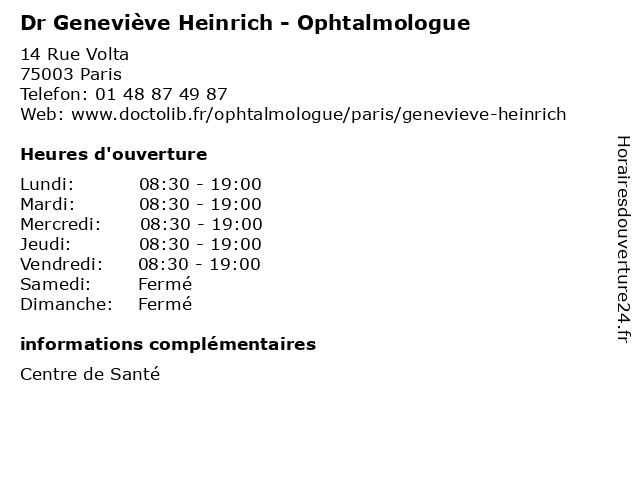 1 Dr Geneviève Heinrich - Ophtalmologue (Distance: 2,78 km) 36 Rue d'Assas, 75006 Paris consultation, docteur, dr, geneviève, heinrich, med, médecin, médecine, ophtalmologue, traitement 2 Dr Geneviève Heinrich - Ophtalmologue (Distance: 4,22 km) 21 Rue du Moulinet,, 75013 Paris dr, geneviève, heinrich, médecin, médecine, médical, ophtalmologue, pharmaceutique, traitement 3 Dr Flavie Rocher - Ophtalmologue (Distance: 0,00 km) 14 Rue Volta, 75003 Paris centre, consultation, de, docteur, dr, flavie, med, médecin, médecine, ophtalmologue, pouzin, rocher, santé, secrétariat, traitement, yvonne 4 Dr Genevieve Heinrich - Ophtalmologue (Distance: 0,00 km) 14 Rue Volta, 75003 Paris centre, consultation, de, docteur, dr, genevieve, heinrich, med, médecin, médecine, ophtalmologue, pouzin, santé, secrétariat, traitement, yvonne 5 Dr Pierre Delacour - Ophtalmologue (Distance: 0,00 km) 14 Rue Volta, 75003 Paris centre, consultation, de, delacour, docteur, dr, med, médecin, médecine, ophtalmologue, pierre, pouzin, santé, secrétariat, traitement, yvonne 6 Dr Carole Chouraqui - Ophtalmologue (Distance: 0,00 km) 14 Rue Volta, 75003 Paris carole, chouraqui, consultation, docteur, dr, med, médecin, ophtalmologue, traitement |
