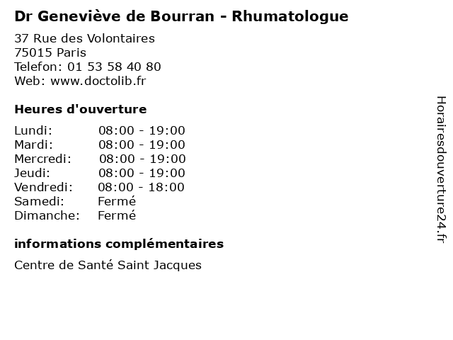 1 Dr Geneviève de Bourran - Rhumatologue (Distance: 4,02 km) 44 Rue Charles Moureu, 75013 Paris bourran, de, dr, geneviève, médecin, médecine, médical, pharmaceutique, rhumatologue, traitement 2 Pr Bernard Amor - Rhumatologue (Distance: nan km) 37 Rue des Volontaires, 75015 Paris amor, bernard, médecin, médecine, médical, pharmaceutique, pr, rhumatologue, traitement 3 Dr Geneviève Habif - Chirurgien-dentiste (Distance: 0,19 km) 178 Rue de Vaugirard, 75015 Paris chirurgie, chirurgien, dentaire, dentiste, dr, geneviève, habif 4 Groupe Clinifutur-Clinique Sainte-Geneviève (Distance: 2,18 km) 29 Rue Sarrette, 75014 Paris clinifutur, clinique, geneviève, groupe, hôpital, hôpitaux, sainte, santé, services 5 Groupe Clinifutur-Clinique Sainte-Geneviève (admissions) (Distance: 2,18 km) 29 Rue Sarrette, 75014 Paris admissions, clinifutur, clinique, geneviève, groupe, hôpital, hôpitaux, sainte, santé, services 6 Clinique Sainte Geneviève (Distance: 2,18 km) 29 rue Sarrette, 75014 Paris chirurgie plastique et esthétique, clinique, dermatologique, gastro-entérologie, geneviève, implantologie dentaire, ophtalmologique, orl, sainte  |