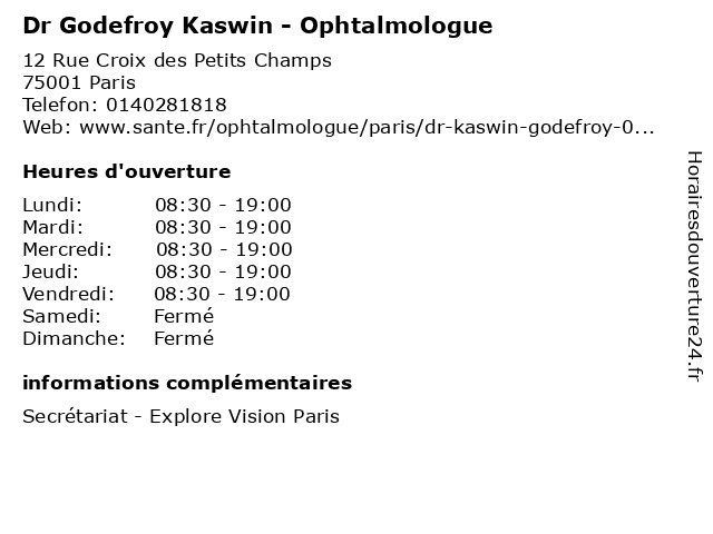 1 Dr Godefroy Kaswin - Ophtalmologue (Distance: 6,00 km) 78 Avenue du Général Leclerc, 94270 Le Kremlin-Bicêtre consultation, docteur, dr, godefroy, kaswin, med, médecin, médecine, ophtalmologue, traitement 2 Dr Francois Perrenoud - Ophtalmologue (Distance: 0,00 km) 12 Rue Croix des Petits Champs, 75001 Paris consultation, docteur, dr, francois, med, médecin, ophtalmologue, perrenoud, traitement 3 Dr Mate Streho - Ophtalmologue (Distance: 0,00 km) 12 Rue Croix des Petits Champs, 75001 Paris consultation, docteur, dr, mate, med, médecin, ophtalmologue, streho, traitement 4 Dr Claire Scemama - Ophtalmologue (Distance: 0,43 km) 17 rue des Prêtres Saint-Germain l'Auxerrois, 75001 Paris claire, consultation, docteur, dr, med, médecin, médecine, ophtalmologue, scemama, traitement 5 Dr Mustapha Benchaboune - Ophtalmologue (Distance: 0,77 km) 106 Rue Réaumur, 75002 Paris benchaboune, dr, mustapha, médecin, médecine, médical, ophtalmologue, pharmaceutique, traitement 6 Dr Amine Chibane - Ophtalmologue (Distance: 0,77 km) 106 Rue Réaumur, 75002 Paris amine, chibane, dr, médecin, médecine, médical, ophtalmologue, pharmaceutique, traitement |