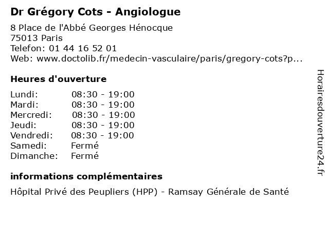 1 Dr Grégory Cots - Angiologue (Distance: 9,48 km) 55 Rue Henri Barbusse, 93300 Aubervilliers angiologue, cots, dr, grégory, médecin, médecine, médical, pharmaceutique, secrétariat, traitement 2 Dr Armelle Piry-Carpentier - Angiologue (Distance: 0,00 km) 8 Place de l'Abbé Georges Hénocque, 75013 Paris angiologue, armelle, carpentier, consultation, docteur, dr, med, médecin, médecine, piry, secrétariat, traitement 3 Dr Isabelle Contre - Angiologue (Distance: 0,00 km) 8 Place de l'Abbé Georges Hénocque, 75013 Paris angiologue, consultation, contre, docteur, dr, isabelle, med, médecin, médecine, secrétariat, traitement 4 Dr Alain Struk - Angiologue (Distance: 0,43 km) 21 Rue du Moulinet, 75013 Paris alain, angiologue, dr, médecin, médecine, médical, pharmaceutique, struk, traitement 5 Dr Lydie Attia-Hagege - Angiologue (Distance: 0,96 km) 6 Rue du Docteur Ténine, 94250 Gentilly angiologue, attia, dr, hagege, lydie, médecin, médecine, médical, pharmaceutique, secretariat, traitement 6 Dr Lydie Attia-Hagege - Angiologue (Distance: 1,03 km) 6 Rue du Docteur Ténine, 94250 Gentilly angiologue, attia, consultation, docteur, dr, hagege, lydie, med, médecin, médecine, secrétariat, traitement |