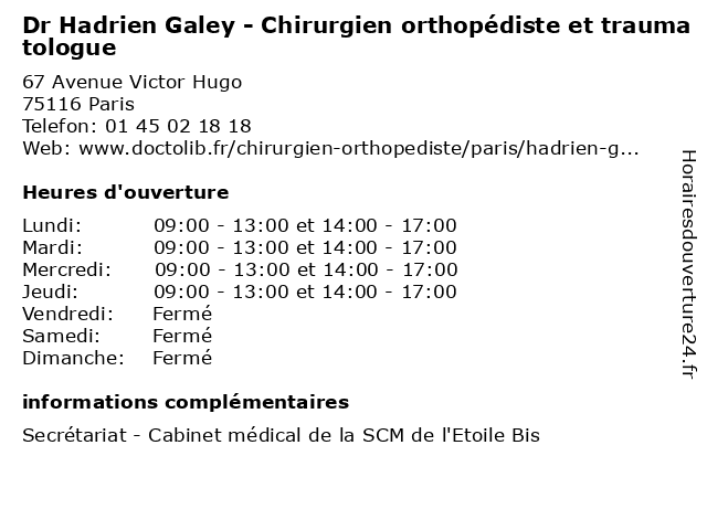 1 Dr Hadrien Galey - Chirurgien orthopédiste et traumatologue (Distance: 3,04 km) 23 Rue Brochant, 75017 Paris chirurgien, dr, et, galey, hadrien, orthopédiste, traumatologue 2 Dr Hadrien Galey - Chirurgien orthopédiste et traumatologue (Distance: 3,45 km) 53 Rue Victor Hugo, 92400 Courbevoie chirurgien, consultation, docteur, dr, et, galey, hadrien, med, médecin, orthopédiste, traitement, traumatologue 3 Dr Cesar Vincent - Chirurgien orthopédiste et traumatologue (Distance: 0,07 km) 5 Rue Leroux, 75116 Paris cesar, chirurgien, docteur, dr, et, médecin, orthopédiste, traumatologue, vincent 4 Dr Constantin Sokolow - Chirurgien orthopédiste et traumatologue (Distance: 0,24 km) 5 Rue du Dôme, 75116 Paris chirurgien, constantin, dr, et, médecin, médecine, médical, orthopédiste, pharmaceutique, secretariat, sokolow, traitement, traumatologue 5 Dr Marc Juvenspan - Chirurgien orthopédiste et traumatologue (Distance: 0,24 km) 5 Rue du Dôme, 75116 Paris chirurgien, dr, et, juvenspan, marc, orthopedie, orthopédique, orthopédiste, trauma, traumatologie, traumatologique, traumatologue 6 Dr Frédérique Mazodier-Thervet - Chirurgien orthopédiste et traumatologue (Distance: 0,24 km) 5 Rue du Dôme, 75116 Paris chirurgien, dr, et, frédérique, mazodier, médecins, médicaments, orthopédiste, santé, secrétariat, spécialiste, thervet, traumatologue |
