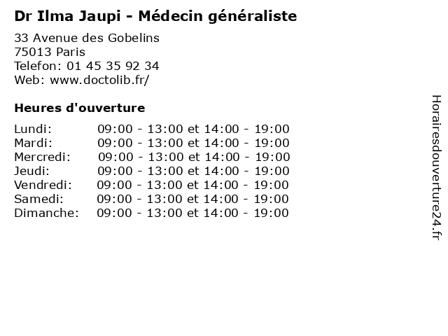 | Mardi | 09:00-13:00 et 14:00-19:00 |