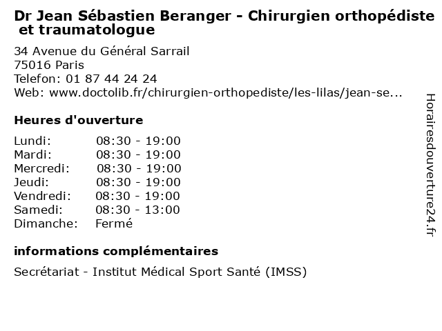 1 Dr Jean Sébastien Beranger - Chirurgien orthopédiste et traumatologue (Distance: 12,88 km) 41 Avenue du Maréchal Juin, 93260 Les Lilas beranger, chirurgie, chirurgien, dr, et, general, jean, orthopédiste, sebastien, soins, sébastien, traumatologue 2 Dr Grégoire Ciais - Chirurgien orthopédiste et traumatologue (Distance: 0,00 km) 34 Avenue du Général Sarrail, 75016 Paris chirurgien, ciais, consultation, docteur, dr, et, grégoire, med, médecin, médecine, orthopédiste, traitement, traumatologue 3 Dr Sébastien Zilber - Chirurgien orthopédiste et traumatologue (Distance: 0,00 km) 34 Avenue du Général Sarrail, 75016 Paris chirurgien, consultation, docteur, dr, et, med, médecin, médecine, orthopédiste, sébastien, traitement, traumatologue, zilber 4 Dr Nicolas Solignac - Chirurgien orthopédiste et traumatologue (Distance: 0,00 km) 34 Avenue du Général Sarrail, 75016 Paris chirurgien, consultation, docteur, dr, et, med, médecin, médecine, nicolas, orthopédiste, solignac, traitement, traumatologue 5 Dr Frédéric Sailhan - Chirurgien orthopédiste et traumatologue (Distance: 0,00 km) 34 Avenue du Général Sarrail, 75016 Paris chirurgien, consultation, docteur, dr, et, frederic, frédéric, med, médecin, médecine, orthopédiste, sailhan, traitement, traumatologue 6 Dr Jérôme Sadaka - Chirurgien orthopédiste et traumatologue (Distance: 0,00 km) 34 Avenue du Général Sarrail, 75016 Paris chirurgien, consultation, docteur, dr, et, jérôme, med, médecin, médecine, orthopédiste, sadaka, traitement, traumatologue |