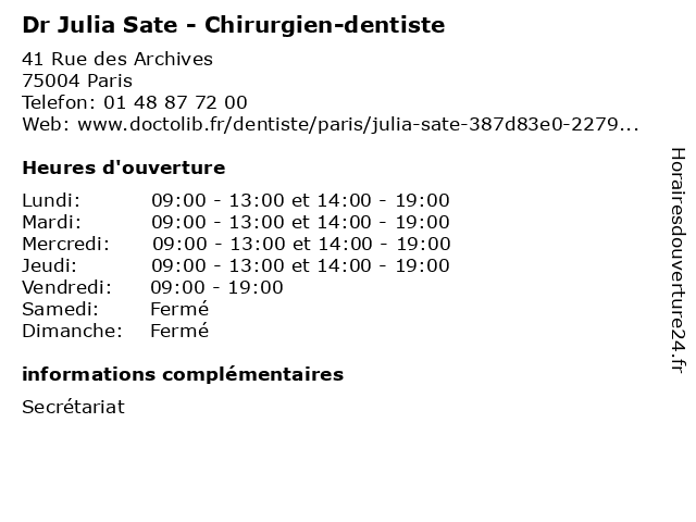 1 Dr Julia Sate - Chirurgien-dentiste (Distance: 3,21 km) 66 Rue Stendhal, 75020 Paris chirurgien, consultation, dentiste, docteur, dr, julia, med, médecin, médecine, sate, traitement 2 Maître Julia Capraro - Avocate (Distance: 0,34 km) 5 Rue du Renard, 75004 Paris avocate, avocats, capraro, civils, droits, julia, juridiques, maître 3 Maître Julia Le Floc’h-Abdou - Avocate (Distance: 0,51 km) 20 Rue Saint Martin, 75004 Paris abdou, avocate, avocats, cabinet, conseils, contentieux, floc’h, julia, juridique, justice, le, litiges, maître, services 4 Dr Julia Peruzzo - Chirurgien-dentiste (Distance: 0,77 km) 116 Rue de Rivoli, 75001 Paris chirurgien, consultation, dentiste, docteur, dr, julia, med, médecin, peruzzo, traitement 5 Maître Julia Joseph-Louisia - Avocate (Distance: 0,88 km) 16 quai des Célestins, 75004 Paris avocate, avocats, cabinet, conseils, contentieux, joseph, julia, juridique, justice, litiges, louisia, maître, services 6 Maître Julia Jabin - Avocate (Distance: 0,90 km) 27 Rue du Pont Neuf, 75001 Paris avocate, avocats, cabinet, conseils, contentieux, jabin, julia, juridique, justice, litiges, maître, services  |