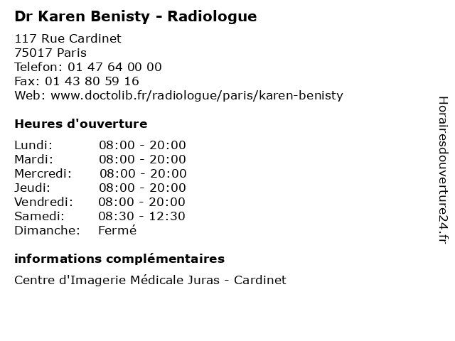 1 Dr Karen Benisty - Radiologue (Distance: 0,00 km) 117 Rue Cardinet, 75017 Paris benisty, consultation, docteur, dr, karen, med, médecin, radiologue, traitement 2 Dr Karen Benisty - Radiologue (Distance: 0,86 km) 21 Rue de Chazelles, 75017 Paris benisty, consultation, docteur, dr, karen, med, médecin, radiologue, traitement 3 Dr Karen Benisty - Radiologue (Distance: 3,78 km) 48 Rue Nicolo, 75116 Paris benisty, consultation, docteur, dr, karen, med, médecin, radiologue, traitement 4 Dr Karen Benisty - Radiologue (Distance: 4,01 km) 18 Boulevard de Grenelle, 75015 Paris benisty, consultation, docteur, dr, karen, med, médecin, radiologue, traitement 5 Dr Karen Benisty - Radiologue (Distance: 4,02 km) 21 Rue Oudinot, 75007 Paris benisty, dr, karen, médecin, médecine, médical, pharmaceutique, radiologue, secretariat, traitement 6 Pharmacie Benisty Isaac (Distance: 3,11 km) 15 Boulevard Voltaire, 92600 Asnières-sur-Seine benisty, herboristerie, isaac, médicaments, paramédical, parapharmacie, pharmacie, pharmacien, santé, traitements |