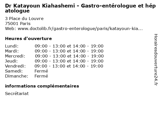 1 Dr Bogdan Vatra - Gastro-entérologue et hépatologue (Distance: 0,06 km) 17 Rue des Prêtres Saint-Germain l'Auxerrois, 75001 Paris bogdan, dr, enterelogue, entérologue, et, gastro, hepatolgue, hépatologue, soins, vatra 2 Dr Paul Benfredj - Gastro-entérologue et hépatologue (Distance: 0,37 km) 61 Rue de Rivoli, 75001 Paris benfredj, consultation, docteur, dr, entérologue, et, gastro, hépatologue, med, médecin, médecine, paul, traitement 3 Dr Annick Zaleski-Benfredj - Gastro-entérologue et hépatologue (Distance: 0,37 km) 61 Rue de Rivoli, 75001 Paris annick, benfredj, docteur, dr, entérologue, et, gastro, hépatologue, medecin, sante, services, zaleski 4 Dr Gilles Lesur - Gastro-entérologue et hépatologue (Distance: 0,77 km) 127 Boulevard Saint-Germain, 75006 Paris dr, enterelogue, entérologue, et, gastro, gilles, hepatolgue, hépatologue, lesur, soins 5 Dr Abdelmajid Ben-Jazia - Gastro-entérologue et hépatologue (Distance: 0,95 km) 29 Rue de Turbigo, 75002 Paris abdelmajid, ben, dr, entérologue, et, gastro, hépatologue, jazia, médecin, médecine, médical, pharmaceutique, secrétariat, traitement 6 Dr Lotfi Mehtari - Gastro-entérologue et hépatologue (Distance: 1,05 km) 106 Rue Réaumur, 75002 Paris dr, entérologue, et, gastro, hépatologue, lotfi, mehtari, médecin, médecine, médical, pharmaceutique, traitement |