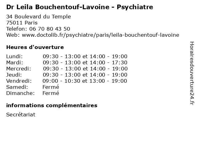 | Vendredi | 09:00-10:30 et 13:00-19:00 |
