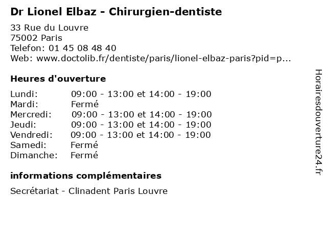 1 Dr Lionel Elbaz - Chirurgien-dentiste (Distance: 4,01 km) 7 Rue Violet, 75015 Paris chirurgien, consultation, dentiste, docteur, dr, elbaz, lionel, med, médecin, médecine, traitement 2 Maître Lionel Busson - Avocat (Distance: 0,33 km) 14 Rue Vivienne, 75002 Paris avocat, busson, justice, lionel, lois, maitre, maître 3 Doh Sullivan Lionel Aubin (Distance: 0,57 km) 19 Rue Du Caire, 75002 Paris aubin, doh, lionel, restaurants, sullivan 4 Maître Lionel Henry - Avocat (Distance: 0,78 km) 10 rue des Pyramides, 75001 Paris avocat, avocats, cabinet, conseils, contentieux, henry, juridique, justice, lionel, litiges, maître, services 5 Dr Lionel Tsiang - Pédicure-podologue (Distance: 1,00 km) 14 Rue Volta, 75003 Paris centre, de, docteur, dr, generaliste, lionel, medical, podologue, pouzin, pédicure, santé, soin, tsiang, yvonne 6 Dr Lionel Levy - Gynécologue obstétricien (Distance: 1,42 km) 6 Place Saint-Michel, 75006 Paris consultation, docteur, dr, gynécologue, levy, lionel, med, médecin, obstétricien, traitement |