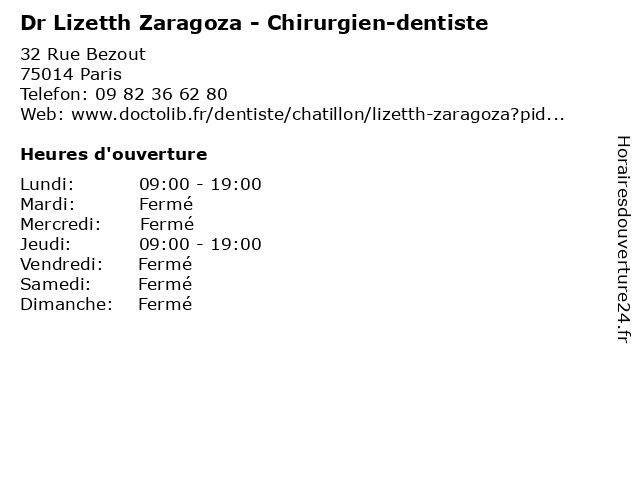 1 Dr Lizetth Zaragoza - Chirurgien-dentiste (Distance: 3,19 km) 1 Avenue Saint-Exupéry, 92320 Châtillon chirurgien, dentaire, dentiste, dr, implantologie, lizetth, parodontologie, zaragoza 2 Dr Cécile Darricau - Chirurgien-dentiste (Distance: 0,00 km) 32 Rue Bezout, 75014 Paris cecile, chirurgien, cécile, darricau, dentaire, dentiste, dr, implantologie, parodontologie 3 Dr Pauline Marcilhacy - Chirurgien-dentiste (Distance: 0,00 km) 32 Rue Bezout, 75014 Paris chirurgien, dent, dentiste, docteur, dr, marcilhacy, pauline, soins 4 Pia Bornens - Chirurgien-dentiste (Distance: 0,00 km) 32 Rue Bezout, 75014 Paris bornens, chirurgien, dent, dentiste, docteur, pia, soins 5 Dr Myriam Derman - Chirurgien dentiste (Distance: 0,09 km) 55 Avenue du Général Leclerc, 75014 Paris chirurgien, consultation, dentiste, derman, docteur, dr, med, myriam, médecin, médecine, traitement 6 Dr Jessica Scherman-Zouari - Chirurgien-dentiste (Distance: 0,09 km) 55 Avenue du Général Leclerc, 75014 Paris chirurgien, dentaire, dentiste, dr, implantologie, jessica, parodontologie, scherman, zouari |