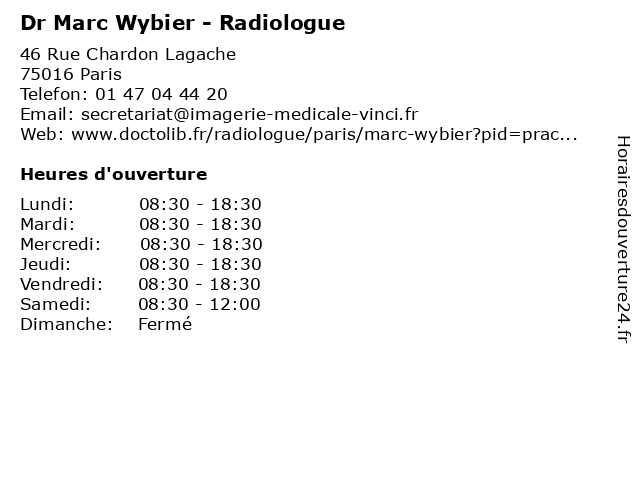 1 Dr Marc Wybier - Radiologue (Distance: 0,15 km) 6 Square Jouvenet, 75016 Paris consultation, docteur, dr, marc, med, médecin, radiologue, traitement, wybier 2 Dr Marc Wybier - Radiologue (Distance: 0,31 km) 37 Rue Molitor, 75016 Paris consultation, docteur, dr, marc, med, médecin, radiologue, traitement, wybier 3 Dr Marc Wybier - Radiologue (Distance: 1,48 km) 80 Avenue Felix Faure, 75015 Paris consultation, docteur, dr, marc, med, médecin, radiologue, traitement, wybier 4 Dr Marc Wybier - Radiologue (Distance: 2,18 km) 43 Rue Cortambert, 75116 Paris dr, marc, médecin, médecine, médical, pharmaceutique, radiologue, secretariat, traitement, wybier 5 Dr Marc Wybier - Radiologue (Distance: 2,18 km) 43 Rue Cortambert, 75016 PARIS dr, marc, médecin, médecine, médical, pharmaceutique, radiologue, secretariat, traitement, wybier 6 Dr Marc Wybier - Radiologue (Distance: 3,65 km) 5 bis rue du Dôme, 75116 Paris docteur, dr, marc, médecin, radiologie, radiologue, wybier |