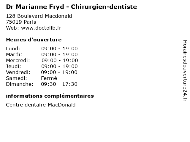 1 Dr Marianne Fryd - Chirurgien-dentiste (Distance: 11,97 km) 12-14 Rue du Général de Gaulle, 94400 Vitry-sur-Seine chirurgien, consultation, dentiste, docteur, dr, fryd, marianne, med, médecin, médecine, secrétariat, traitement 2 Dr Marianne Langlois - Médecin généraliste (Distance: 1,23 km) 64 Rue de la Commune de Paris, 93300 Aubervilliers docteur, dr, generaliste, généraliste, langlois, marianne, medical, médecin, soin 3 Clinique Vétérinaire Docteur Marianne Maréchal (Distance: 2,63 km) 4 Rue Versigny, 750118 Paris clinique, consultation, docteur, hospitalisation, marianne, maréchal, soins, urgence, veterinaire, vétérinaire 4 Dr. Marianne Autie-Ophtalmologie (Distance: 2,74 km) 2 Rue Ambroise Paré,, 75010 Paris autie, consultation, docteur, dr., marianne, ophtalmologie, santé 5 Dr Marianne Comba - Médecin généraliste (Distance: 2,89 km) 391 Rue des Pyrénées, 75020 Paris comba, docteur, dr, generaliste, généraliste, marianne, medecin, médecin, soins 6 Marianne Le Frapper - Masseur-kinésithérapeute (Distance: 4,12 km) 2 Rue Du Dr Delafontaine, 93205 Saint Denis consultation, docteur, frapper, kinésithérapeute, le, marianne, masseur, med, médecin, traitement |
