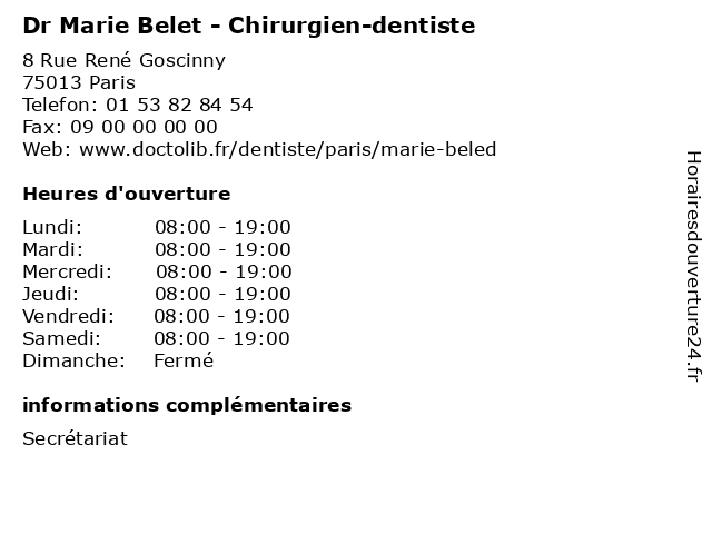 1 Dr Marie Belet - Chirurgien-dentiste (Distance: 3,19 km) 7 avenue de la République, 94200 Ivry-sur-Seine belet, chirurgien, consultation, dentiste, docteur, dr, marie, med, medecine, medical, médecin, traitement 2 Virginie Belet - Psychologue (Distance: 27,99 km) 10 rue du Champ Gaillard, 78300 Poissy belet, consultation, docteur, med, médecin, médecine, psychologue, traitement, virginie 3 Philippe Belet Architecte (Distance: 32,25 km) 206 Rue Paul Doumer, 78510 Triel-sur-Seine agence, architecte, belet, maison, philippe, projet 5 Dr Anne-Laure Charreteur - Chirurgien-dentiste (Distance: 0,00 km) 8 Rue René Goscinny, 75013 Paris anne, charreteur, chirurgien, dentaire, dentiste, dr, implantologie, laure, parodontologie 6 Dr Rebecca Choukroun - Chirurgien Dentiste (Distance: 1,10 km) 76 Rue Dunois, 75013 Paris 75013, centre, chevaleret, chirurgien, choukroun, dentaire, dentiste, dr, dr rebecca, paris, rebecca |