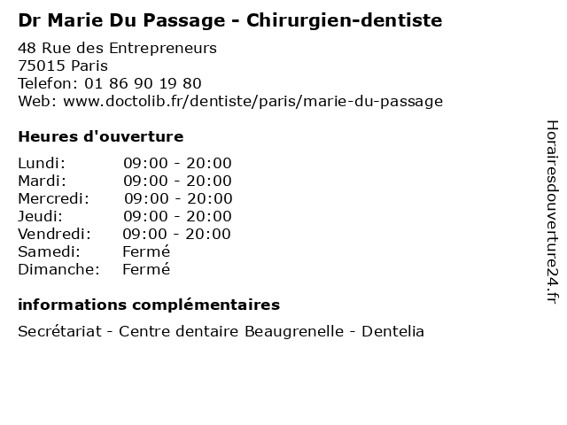 1 Dr Marie du Passage - Chirurgien-dentiste (Distance: 2,30 km) 30 Boulevard de Vaugirard, 75015 Paris centre, chirurgien, dentaire, dentiste, dr, du, implantologie, marie, montparnasse, parodontologie, passage 2 Dr Marie du Passage - Chirurgien-dentiste (Distance: 9,03 km) 128 Boulevard Macdonald, 75019 Paris centre, chirurgien, dentaire, dentiste, dr, du, implantologie, macdonald, marie, parodontologie, passage 3 Dr Marie Du Passage - Chirurgien-dentiste (Distance: 11,97 km) 32 Rue du Maréchal Foch, 78000 Versailles chirurgien, consultation, dentiste, docteur, dr, du, marie, med, médecin, passage, traitement 4 Passage Bleu (Distance: 0,52 km) 12 De Linois, 75015 Paris beaute, bleu, cafe, chaussures, enfants, mode femmes, mode hommes, passage, restaurant, sport 5 Le Passage (Distance: 4,83 km) 46 rue des Fossés Saint Bernard, 75005 Paris brasserie, café, français, le, passage, restaurant, restauration 6 Dr Aude du Passage - Gynécologue obstétricien (Distance: 5,07 km) 3 Place Silly, 92210 Saint-Cloud aude, consultation, docteur, dr, du, gynécologue, med, médecin, obstétricien, passage, traitement |