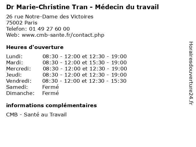 1 Dr Isabelle Gury - Médecin du travail (Distance: 0,00 km) 26 rue Notre-Dame des Victoires, 75002 Paris consultation, docteur, dr, du, gury, isabelle, med, médecin, traitement, travail 2 Dr Marie-France Cachat - Médecin du travail (Distance: 0,00 km) 26 rue Notre-Dame des Victoires, 75002 Paris cachat, consultation, docteur, dr, du, france, marie, med, médecin, traitement, travail 3 Dr Geneviève Deverre - Médecin du travail (Distance: 0,00 km) 26 rue Notre-Dame des Victoires, 75002 Paris consultation, deverre, docteur, dr, du, genevieve, geneviève, med, médecin, traitement, travail 4 ACMS - Centre de Santé au Travail (Distance: 0,23 km) 29 Rue du Louvre, 75002 Paris acms, au, bilan, centre, de, santé, travail 5 Arnaud Brochard Avocat (Droit social et Droit pénal du travail) (Distance: 1,43 km) 7 rue de Surène, 75008 Paris arnaud, avocat, avocats, brochard, cabinet, droit, du, et, pénal, représentation, service, social, travail 6 Avocat Droit du travail Ngawa (Distance: 2,05 km) 50 Rue de Miromesnil, 75008 Paris avocat, droit, du, law firm, lawyer, ngawa, travail |