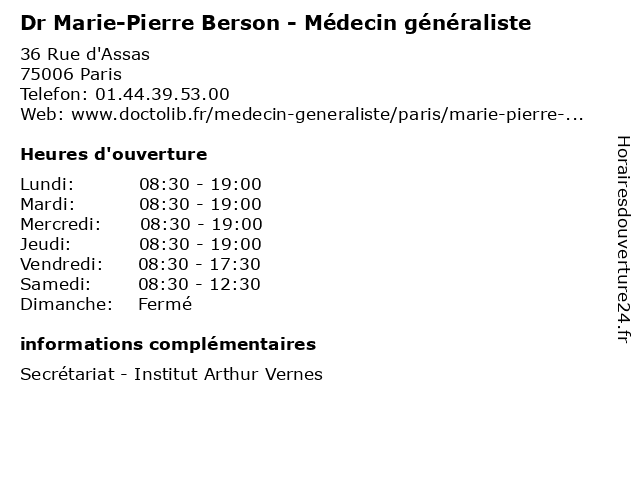 1 Groupe Berson - Expertise Comptable (Distance: 3,49 km) 6 rue de Milan, 75009 Paris aide, argent, berson, comptable, entreprise, expertise, finances, fiscalite, groupe 2 Dr Christophe Berson - Médecin généraliste (Distance: 10,93 km) 37 Avenue de l'Europe, 78140 Vélizy-Villacoublay berson, christophe, docteur, dr, generaliste, généraliste, medical, médecin, soin 3 Maître Solène Garcin-Berson - Avocate (Distance: 15,98 km) 2 ter Rue de Fontenay, 78000 Versailles avocate, avocats, berson, civils, droits, garcin, juridiques, maître, solène 4 Cours de piano Cécile Garcin Berson (Distance: 16,20 km) 3 Rue Borgnis Desbordes, 78000 Versailles berson, cours, cécile, de, garcin, piano 5 Dr Alain Berson - Gastro-entérologue et hépatologue (Distance: 33,55 km) 2 Rue Jules Lefèbvre, 77220 Tournan-en-Brie alain, berson, dr, enterelogue, entérologue, et, gastro, hepatolgue, hépatologue, soins 6 Dr Sophie Pierre - Psychiatre (Distance: 0,00 km) 36 Rue d'Assas, 75006 Paris consultation, docteur, dr, med, médecin, médecine, pierre, psychiatre, sophie, traitement |
