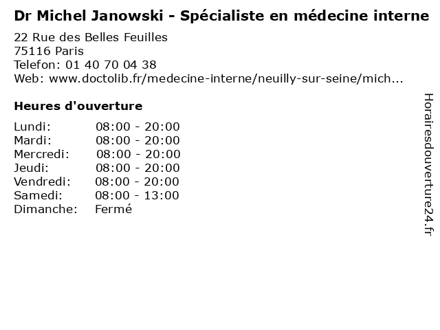 1 Dr Michel Janowski - Spécialiste en médecine interne (Distance: 2,88 km) 55 Boulevard du Château, 92200 Neuilly-sur-Seine consultation, docteur, dr, en, interne, janowski, med, michel, médecin, médecine, spécialiste, traitement 2 Open en Ville (Distance: 0,08 km) 100 rue de Longchamp, 75116 Paris en, magasins, meubles, mobilier, open, ville 3 La Maison du Chocolat (Commande en ligne/retrait) (Distance: 0,17 km) 120 avenue Victor Hugo, 75116 Paris artisan, chocolat, chocolatier, commande, du, en, la, ligne/retrait, maison 4 Dr Bénedikta Reiss - Spécialiste en médecine interne (Distance: 0,30 km) 4 bis Avenue Saint-Honoré d'Eylau, 75016 Paris bénedikta, dr, en, interne, médecine, médecins, médicaments, reiss, santé, secrétariat, spécialiste 5 Dr Benedikta Reiss - Spécialiste en médecine interne (Distance: 0,32 km) 4 Avenue Saint-Honoré d'Eylau, 75016 Paris benedikta, docteur, dr, en, generaliste, interne, medecin, médecine, reiss, soins, spécialiste 6 Agnès Montagnon -Thomas - Spécialiste en médecines douce et alternative (Distance: 0,34 km) 76 avenue Raymond Poincaré, 75016 Paris agnès, alternative, consultation, docteur, douce, en, et, med, montagnon, médecin, médecines, spécialiste, thomas, traitement |