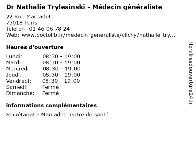 1 Dr Nathalie Trylesinski - Médecin généraliste (Distance: 8,36 km) 5 Rue Amaury Duval, 92120 Montrouge consultation, docteur, dr, généraliste, med, médecin, médecine, nathalie, secrétariat, traitement, trylesinski 2 Dr Nathalie Guyennon - Ophtalmologue (Distance: 0,23 km) 38 Rue Ordener, 75018 Paris dr, guyennon, nathalie, ophtalmologie, ophtalmologistes, ophtalmologue, vision 3 Dr Nathalie Jonin-Cuvillier - Chirurgien-dentiste (Distance: 0,66 km) 31 Rue Pajol, 75018 Paris chirurgien, cuvillier, dentiste, dr, jonin, médecin, médecine, médical, nathalie, pharmaceutique, traitement 4 Maître Nathalie Guerineau - Avocate (Distance: 1,56 km) 6 Rue Mayran, 75009 Paris avocate, avocats, cabinet, conseils, contentieux, guerineau, juridique, justice, litiges, maître, nathalie, services 5 Dr Nathalie Germeau - Gynécologue médical et obstétrique (Distance: 2,05 km) 4 Rue de Thionville, 75019 Paris consultation, docteur, dr, et, germeau, gynécologue, med, médecin, médecine, médical, nathalie, obstétrique, secrétariat, traitement 6 Maître Nathalie Fonvieille - Avocate (Distance: 2,33 km) 6 Rue Bouchardon, 75010 Paris avocat, avocate, droit, fonvieille, maître, nathalie, négociation |