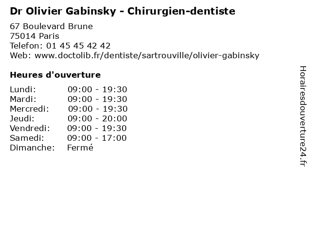 1 Dr Olivier Gabinsky - Chirurgien-dentiste - (Distance: 0,30 km) 67 Boulevard Brune, 75014 Paris chirurgien, consultation, dentiste, docteur, dr, gabinsky, med, médecin, médecine, olivier, secrétariat, traitement 3 Dr Olivier Delye - Médecin généraliste (Distance: 0,97 km) 64 Avenue de la République, 92120 Montrouge delye, docteur, dr, generaliste, généraliste, medecin, médecin, olivier, soins 4 Dr Olivier Gaillard - Chirurgien-dentiste (Distance: 1,09 km) 86 Avenue de la République, 92120 Montrouge chirurgien, dentaire, dentiste, dr, gaillard, implantologie, olivier, parodontologie 5 Dr Olivier Guingand - Chirurgien orthopédiste (Distance: 1,31 km) 42 boulevard Jourdan, 75014 Paris chirurgien, consultation, docteur, dr, guingand, med, médecin, médecine, olivier, orthopédiste, traitement 6 Stricevic Olivier Ljubinka (Distance: 1,49 km) 88 Avenue Du Maine, 75014 Paris ljubinka, olivier, restaurants, stricevic |