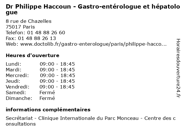 1 Dr Philippe Haccoun - Gastro-entérologue et hépatologue (Distance: 0,51 km) 21 Rue Balzac, 75008 Paris consultation, docteur, dr, entérologue, et, gastro, haccoun, hépatologue, med, médecin, médecine, philippe, traitement 2 Dr Hugues Thauvin - Gastro-entérologue et hépatologue (Distance: 0,00 km) 8 rue de Chazelles, 75017 Paris docteur, dr, entérologue, et, gastro, hugues, hépatologue, thauvin 3 Maître Philippe Moisset - Avocat (Distance: 0,15 km) 108 Rue de Courcelles, 75017 Paris avocat, justice, lois, maitre, maître, moisset, philippe 4 Dr Stéphanie Viennot - Gastro-entérologue et hépatologue (Distance: 0,21 km) 10 Rue Margueritte, 75017 Paris dr, enterelogue, entérologue, et, gastro, hepatolgue, hépatologue, soins, stéphanie, viennot 5 Dr Caroline Coutris - Gastro-entérologue et hépatologue (Distance: 0,21 km) 10 Rue Margueritte, 75017 Paris caroline, coutris, dr, enterelogue, entérologue, et, gastro, hepatolgue, hépatologue, soins 6 Dr. Jean-Marc Gelinet - Gastro-entérologie (Distance: 0,23 km) 17 Rue Daru, 75008 Paris consultation, docteur, dr., entérologie, gastro, gelinet, jean, marc, santé |