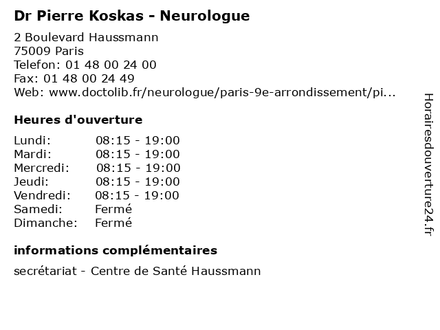 1 Dr Svetlana Scipcaru - Neurologue (Distance: 0,00 km) 2 Boulevard Haussmann, 75009 Paris consultation, docteur, dr, med, médecin, médecine, neurologue, scipcaru, secrétariat, svetlana, traitement 2 Maître Roger Koskas - Avocat (Distance: 0,09 km) 18 boulevard Montmartre, 75009 Paris avocat, avocats, cabinet, conseils, contentieux, juridique, justice, koskas, litiges, maître, roger, services 3 Dr Antonio Marques Atalaia - Neurologue (Distance: 0,78 km) 9 Rue Boudreau, 75009 Paris antonio, atalaia, consultation, docteur, dr, marques, med, médecin, neurologue, traitement 4 Dr. Pierre Koskas - Neurologue (Distance: 0,85 km) 31 Rue de Caumartin, 75009 Paris docteur, dr., electromyogramme, koskas, medecins, neurologue, pierre, sante 5 Gabriel Koskas - Ostéopathe (Distance: 1,83 km) 9 Rue Pelouze, 75008 Paris gabriel, koskas, ostéo, ostéopathe, ostéopathes, soins 6 Maître Sandra Zemmour-Koskas - Avocate (Distance: 2,04 km) 48 rue de Rivoli, 75004 Paris avocate, avocats, cabinet, conseils, contentieux, juridique, justice, koskas, litiges, maître, sandra, services, zemmour |