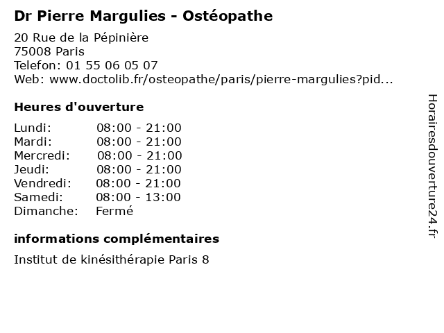 1 Dr Pierre Margulies - Ostéopathe (Distance: 4,22 km) 6 Rue Lacépède, 75005 Paris consultation, docteur, dr, margulies, med, médecin, ostéopathe, pierre, traitement 2 Dr Pierre Margulies - Ostéopathe (Distance: 4,80 km) 36 Boulevard Saint-Marcel, 75005 Paris consultation, docteur, dr, margulies, med, médecin, ostéopathe, pierre, traitement 3 Dr Alain Margulies - Gastro-entérologue et hépatologue (Distance: 0,63 km) 9 Rue Boudreau, 75009 Paris alain, consultation, docteur, dr, entérologue, et, gastro, hépatologue, margulies, med, médecin, traitement 4 Dr Alain Margulies - Gastro-entérologue et hépatologue (Distance: 0,80 km) 27 Rue de Turin, 75008 Paris alain, consultation, docteur, dr, entérologue, et, gastro, gastroenterologie, hépatologue, margulies, santé 5 Dr Anne-Laure Margulies - Gynécologue-obstétricien (Distance: 2,08 km) 147 Rue du Faubourg Poissonnière, 75009 Paris anne, consultation, docteur, dr, gynécologue, laure, margulies, med, médecin, obstétricien, traitement 6 Dr Pascal Margulies - Médecin généraliste (Distance: 3,81 km) 68 Rue Saint-Antoine, 75004 Paris docteur, dr, generaliste, généraliste, margulies, medecin, médecin, pascal, soins |